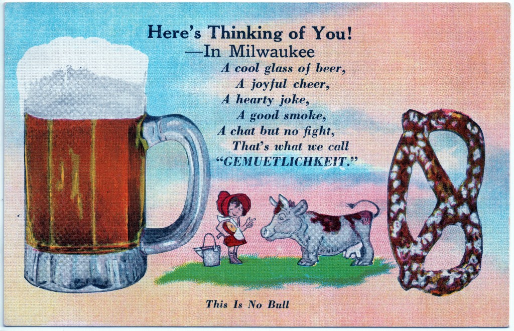 This antique postcard, from long-gone Milwaukee printer E.C. Kropp Co., explains how to get your party on, Milwaukee style: “A cool glass of beer, A joyful cheer, A hearty joke, A good smoke, A chat but no fight, That’s what we call “Gemuetlichkeit.” And, adds the footnote, “This is no bull.”