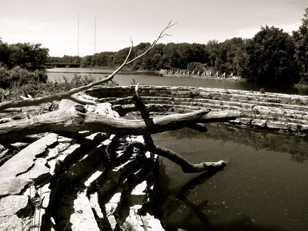 The serpentine spillway is made of concrete faced with limestone blocks. Just a few feet higher than natural river level, the dam provides little downstream protection during major floods. Photo by Carl Swanson