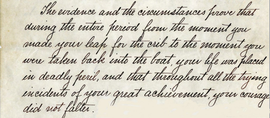 First, I took off my life-preserver and tried to put it on Miller. Trying to maneuver the inert form into proper position as the icy sea beat against us and sought to wash us from our perilous perch was a job that taxed my remaining strength. Finally, with this accomplished, the crew of our lifeboat threw me a heaving line, which I tied securely around Miller’s body. Watching my chance for a lull in the waves, I picked Miller up bodily, managed somehow to get him on my back and crawled with him to the lee side of what remained of the crib, and dumped him over for the crew to haul in.– Ingar Olsen, as told to the Milwaukee Sentinel, May 8, 1931 edition