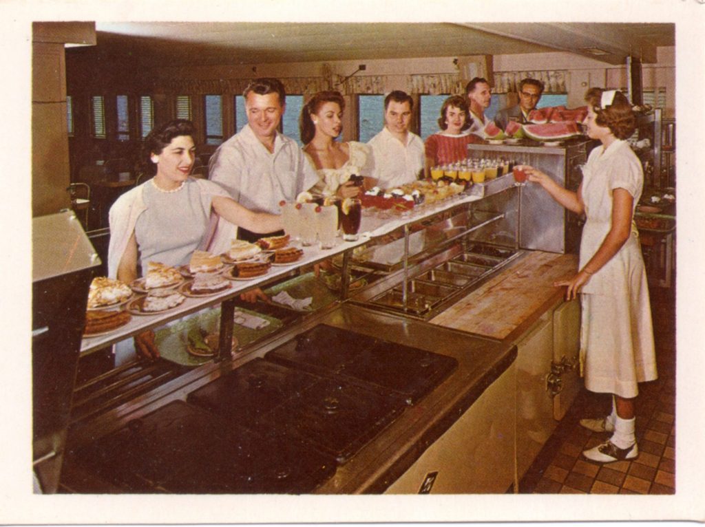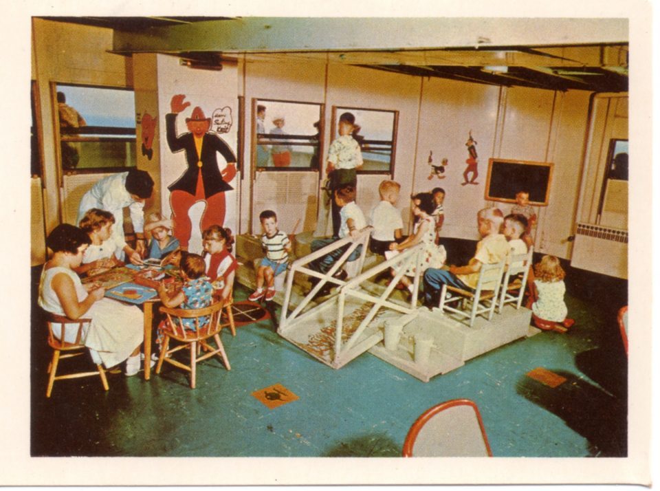 The passengers enjoyed many amenities, including a 185-seat buffet restaurant and a bar with a 25 x 40-foot polished wood dance floor and a live orchestra. The ship also had a broad sun deck lined with chaise lounges, a 144-seat movie theatre, and a supervised children’s playroom.