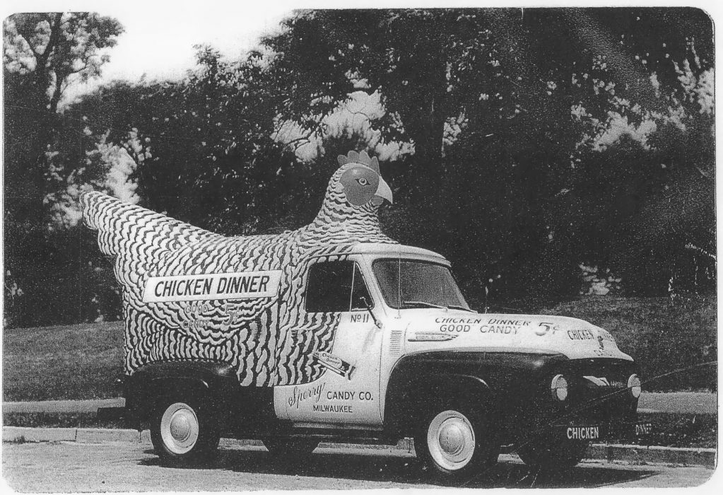 Milwaukee’s Sperry Candy Co. is remembered for its popular – if oddly named – “Chicken Dinner” candy bars, which it delivered in an equally odd fleet of chicken-shaped trucks. Photo courtesy Milwaukee County Historical Society.